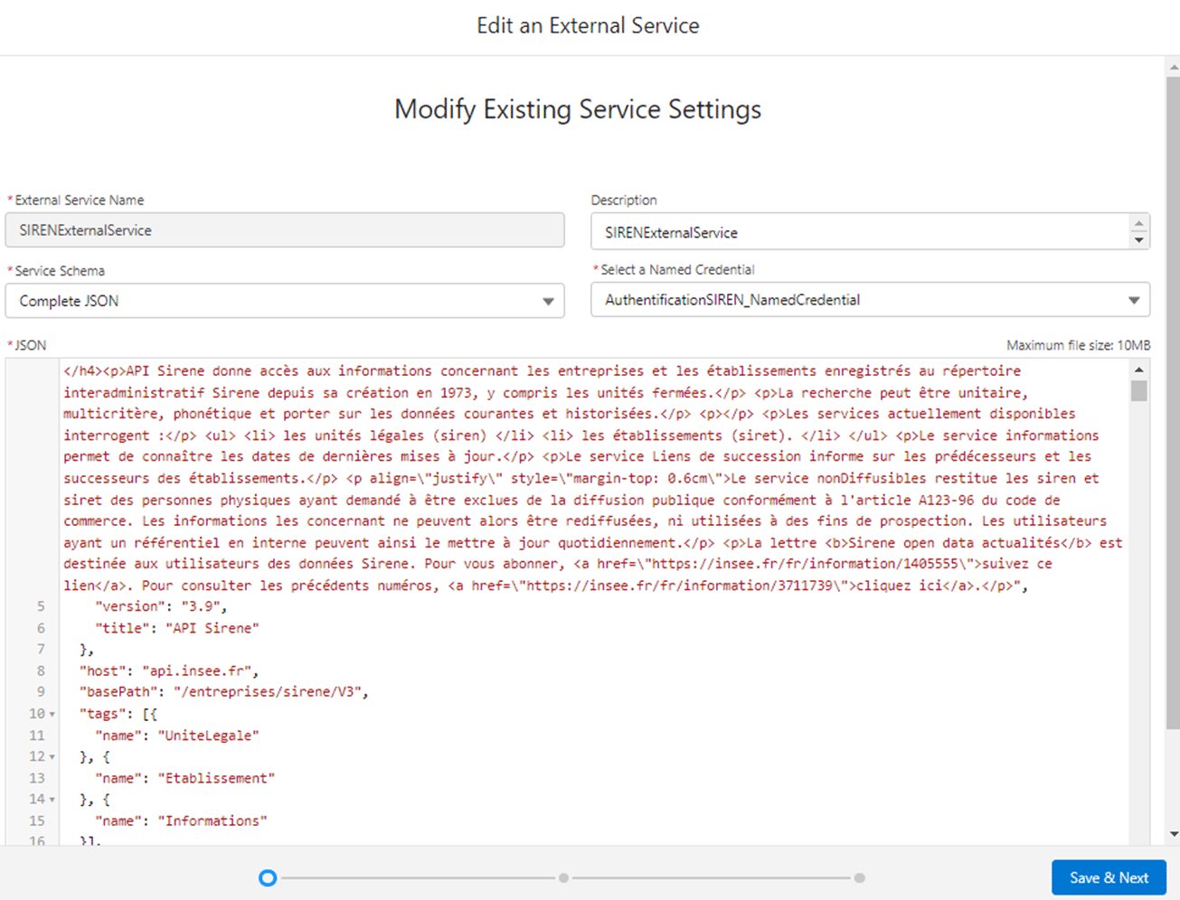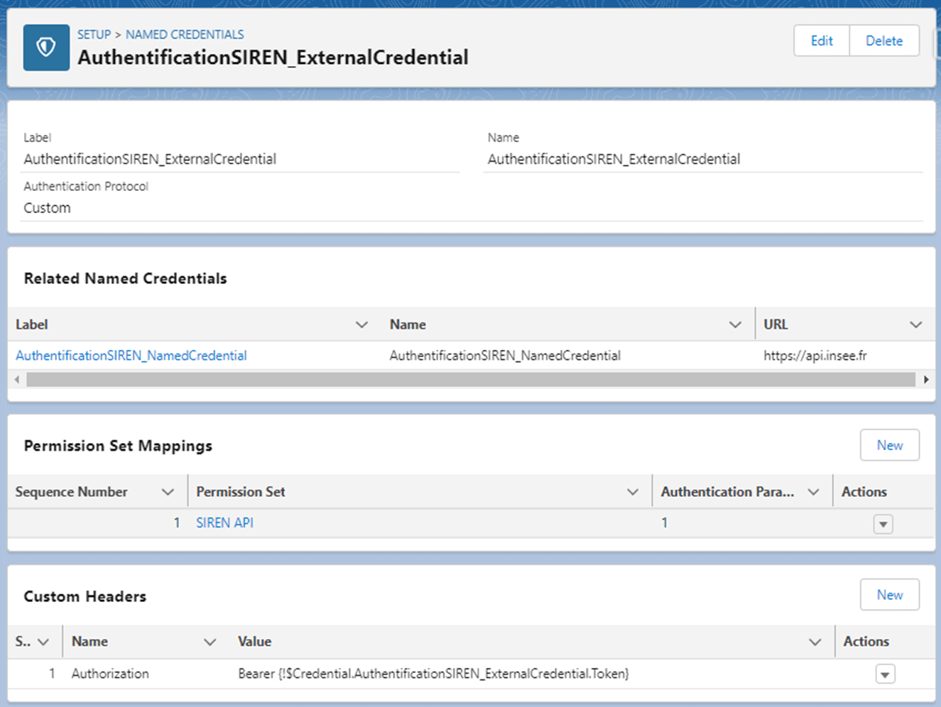 Prenons un exemple : dans le cadre d’une implémentation, un client souhaiterait obtenir le nombre de salariés d’un compte donné à partir de son SIREN. Le site api.gouv.fr référence des Web Service accessible à tous, sous réserve de création d’un compte. Première étape donc, mettre en place le Named Credential. Il va nous permettre de nous authentifier de façon sécurisée auprès du service, en l’occurence l’INSEE.